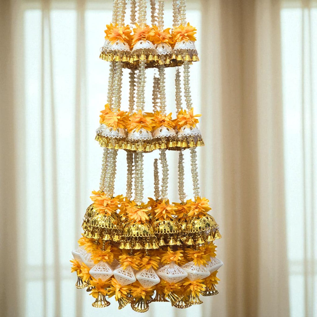 2 Pcs, 4.5 Ft Height Golden & Yellow Decorative Latkan | Festival, Mandir & Home Decoration, Handcrafted Diwali Latkan | Artificial Flower & Bead Hanging Décor | DW0002
