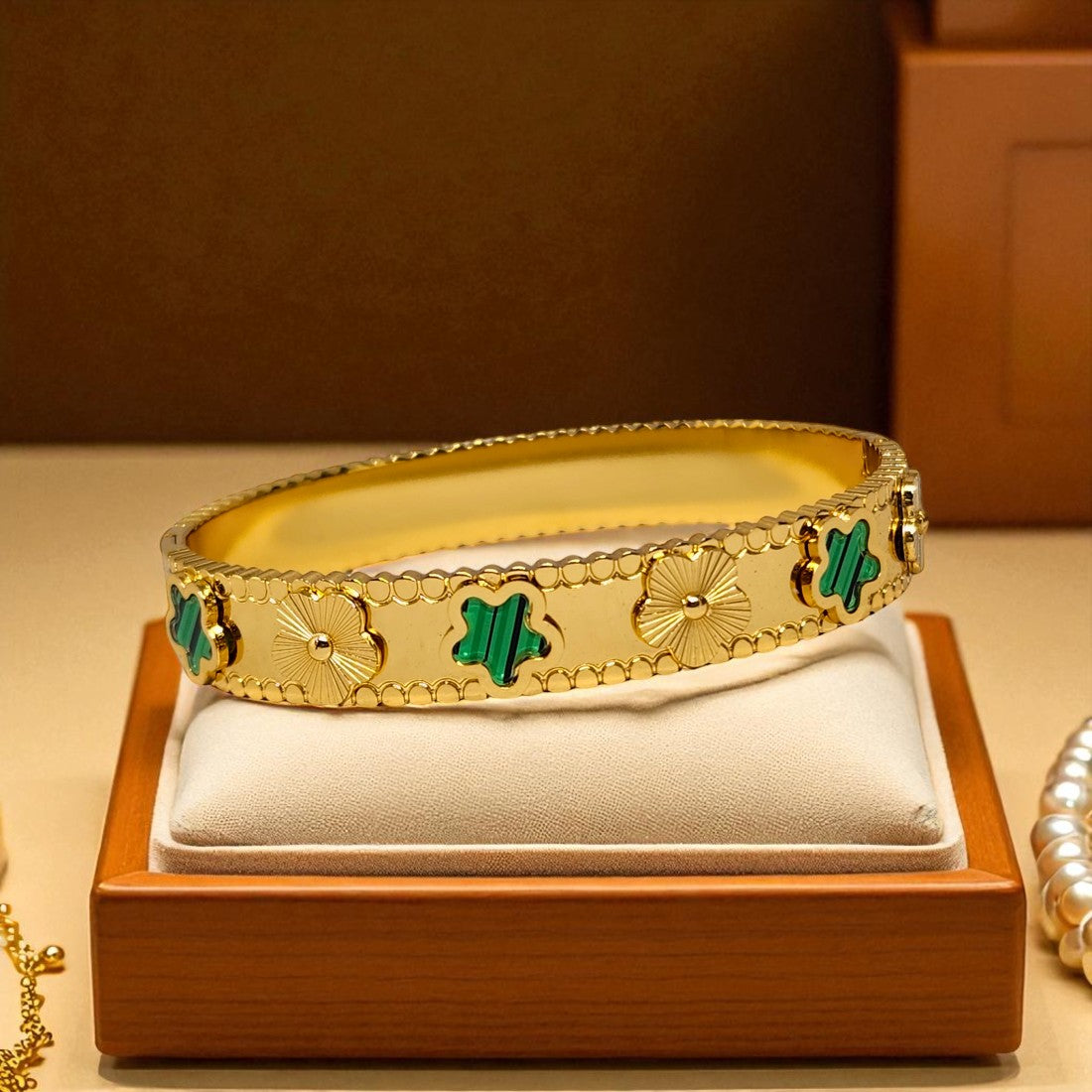 Elevate your jewelry collection with this stunning gold-plated designer bangle, adorned with alternating four-leaf clover motifs in green enamel and... Read more