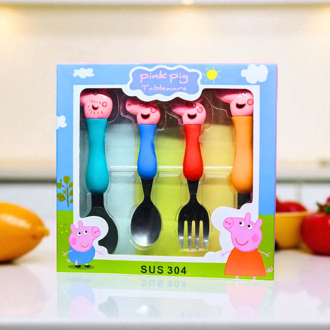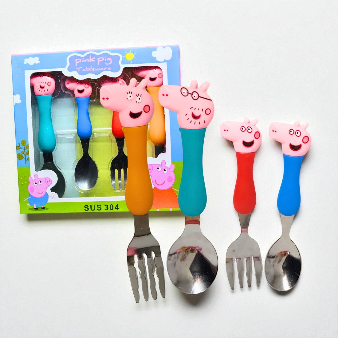 Pink Pig Cute Cartoon Stainless Steel Spoons & Fork Set of 4 for Kids, Colorful Baby Feeding Cutlery | BG0010
