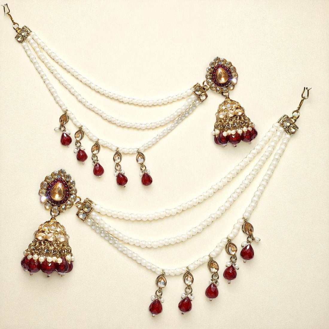 Step into elegance with this exquisite Bridal Pearl Ear Chain featuring radiant red beads, pearl strands, and intricate jhumka earrings adorned with shimmering Kundan stones. This statement piece is crafted for women who embrace traditional beauty with a modern twist. Ideal for bridal wear or festive styling, this ear chain elevates your look effortlessly—be it for weddings, sangeet, Karwa Chauth, or Navratri celebrations.