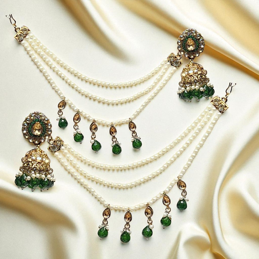 Add a touch of royalty to your ethnic look with this elegant Bridal Pearl Ear Chain, beautifully designed with triple strands of ivory white pearls and green crystal beads. Accented with dazzling Kundan stones and finished with classic jhumka earrings, this traditional ear chain is perfect for weddings, Karwa Chauth, Navratri, and festive occasions. Whether you’re styling a bridal lehenga or a saree, this piece will elevate your look with timeless charm and elegance.